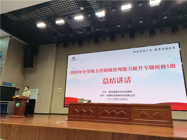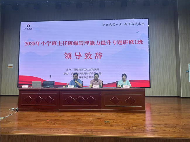 2025年8月4日至8月5日,合肥一六八新店花园学校全体班主任参加新站高新区小学班主任班级管理能力提升专题研修,本次研修旨在进一步提升区域内小学班主任的班级管理能力。开班仪式上,新站高新区社会发展局教育发展中心薛友才、周亮亮以及合肥一六八新店花园学校陶冲湖校区的陈晓艳老师分别做了主题发言,深入阐述了本次培训的重要性,并对培训纪律提出了明确要求,为培训的顺利开展奠定了良好基础。