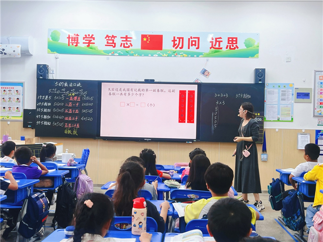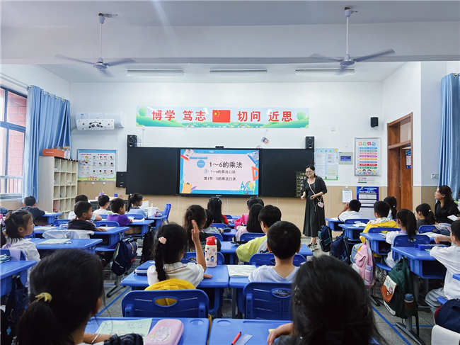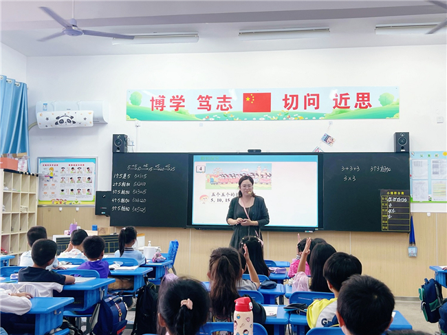 瑟瑟秋风带来了几分寒意,合肥一六八新店花园学校陶冲湖校区二(5)班的课堂却热度十足。二(5)班数学教师周婵君聚焦“5 的乘法口诀”这一核心内容,用精妙的设计为学生打造了一堂兼具知识深度与互动趣味的公开课,直观展现了新课标指引下的小学数学教学新样态。