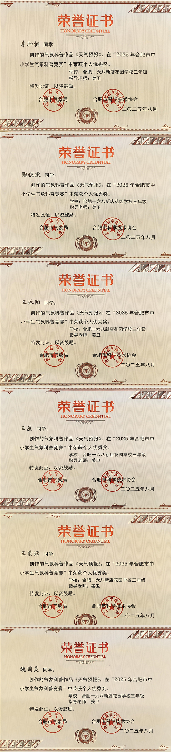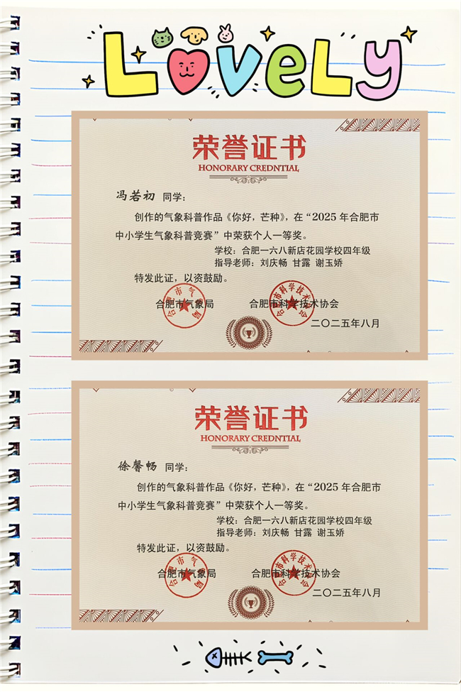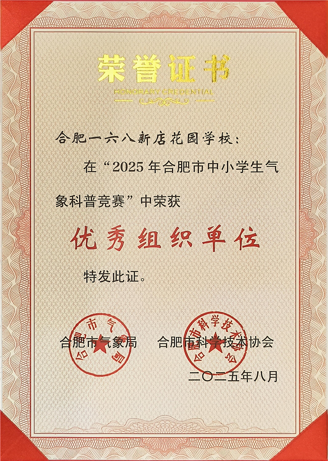我校合肥一六八新店花园学校在此次竞赛中表现优异,共荣获一等奖1项、二等奖1项、三等奖3项、优秀奖19项,并凭借出色的组织工作荣获“优秀组织奖”。这些成绩充分展现了我校学生在气象科学方面的浓厚兴趣和扎实素养,也体现了学校在科技教育与综合素质培养方面的丰硕成果。