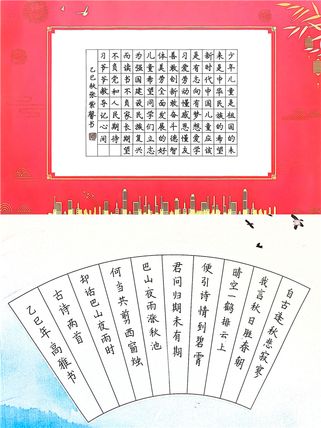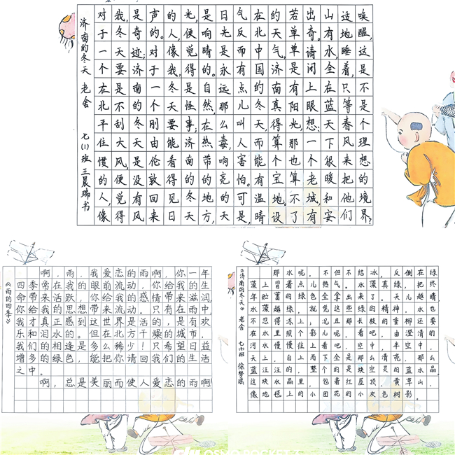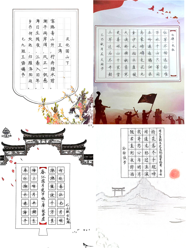 文学韵味在活动中流淌生辉。教室里墨香氤氲,同学们凝神静气,提腕运笔。一横长城长,一竖字铿锵。七(2)班高雅同学的古诗两首笔画清丽规整,婉转间酝酿古诗意蕴,点捺中尽展雅致之美;七(4)班张紫馨同学的作品力透纸背,字字如春苗破土,蓬勃着“少年不负家国望,墨痕犹带读书声”的赤诚力量;七(8)班吴文玥同学的《七律·长征》笔画工整隽秀,字势如铁索铿锵、雪原苍茫,笔走龙蛇间勾勒长征豪情;七(14)班侯方玲同学的《雨的四季》选文虽无大家磅礴气,却有青春清澈音,恰似“细雨湿衣看不见”的诗意流转。这些作品不仅是技巧的展示,更是与历史对话、与文化共鸣的情感体验。
