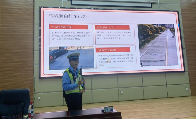 交警支队的曹雨峰警官担任主讲人,结合多年的执法经验和丰富的案例资源,向在场的学生详细解读了中小学生常见的交通违法行为,如闯红灯、逆行、横穿马路等行为的危害性。警官们还特别指出了这些行为背后潜在的安全隐患,以及一旦发生事故可能造成的严重后果。