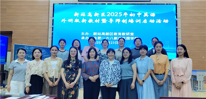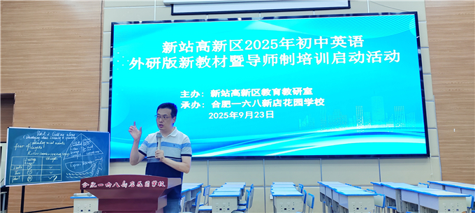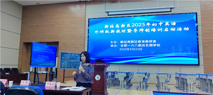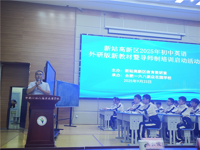 2025年9月23日下午,新站区2025年初中英语外研版新教材暨导师制培训启动活动在合肥一六八新店花园学校中学部一楼报告厅顺利开展,区内各中学七八年级英语教师、2025年初中英语导师制培训全体成员及2025年初中英语新入职初中英语教师约120余人参加了本次活动。