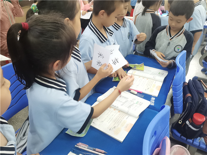 当讨论“‘忙’还体现在哪里”时,“戴月光”一词成为新的教学亮点。教师引导学生联想生活场景,解释“戴月光”即农民白天劳作、夜晚披着月光归家,进而延伸出“披星戴月”的成语,让学生在语境中积累词汇。为巩固所学,课堂开展“农事对对碰”小组活动,学生们手持印有农事名称的词卡与对应图片,快速匹配“采桑”“耕田”“除草”等内容,在互动游戏中加深对农事活动的认知。
