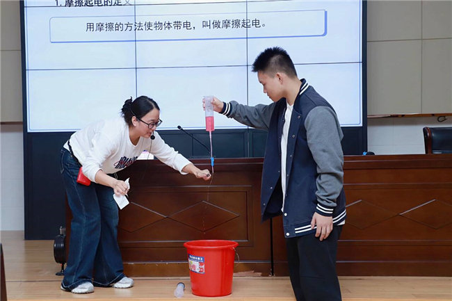 1. 摩擦起电实验:王婷婷老师先演示“摩擦后的塑料棒吸引水流”实验,引导学生观察现象、总结“带电体吸引轻小物体”的性质;随后组织学生分组实验,用玻璃棒、橡胶棒等器材探究摩擦起电规律。过程中强调“规范操作是实验成功的前提”,培养学生严谨的实验态度。