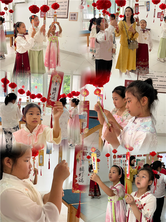 紧接着,同学们来到“猜灯谜”摊位。面对挂满灯笼的谜题,大家热情高涨,或独自思索,或与同学交流探讨,儿童答题时还有志愿者耐心读题、给予提示。每答对一道灯谜,同学们都满心欢喜,在趣味答题过程中,不知不觉积累了中秋民俗与国庆文化知识。