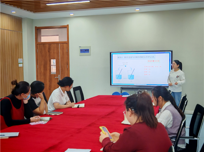 紧接着,科学老师刘悦以《加速溶解》为题,为组内教师带来了一堂精彩的无生试讲,刘悦教态自然,语言精炼,充分展现了扎实的教学功底、巧妙的教学设计、环环相扣的教学环节以及对教学重难点的精准把握。