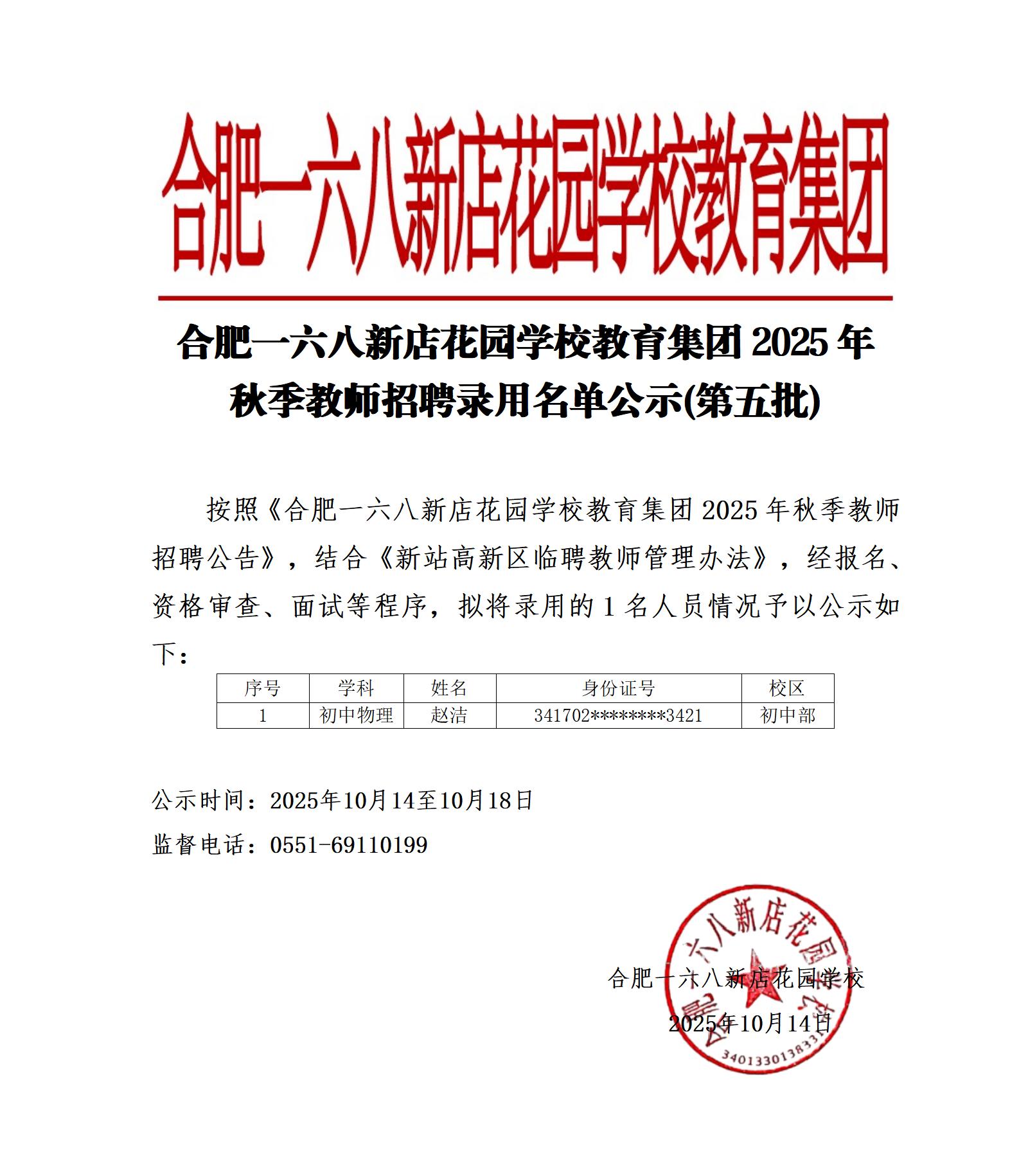 合肥一六八新店花园学校教育集团2025年秋季教师招聘录用名单公示(第五批)
