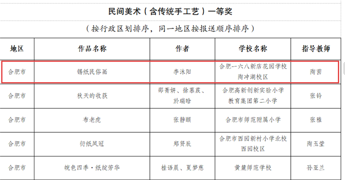 近日,在安徽省教育厅以“坚定文化自信,弘扬徽风皖韵”为主题的全省中小学生中华优秀传统文化传承成果专项展演活动中,合肥一六八新店花园学校陶冲湖校区教师陶茵指导的作品《锡纸民俗画》脱颖而出,荣获民间美术(含传统手工艺)类一等奖。
