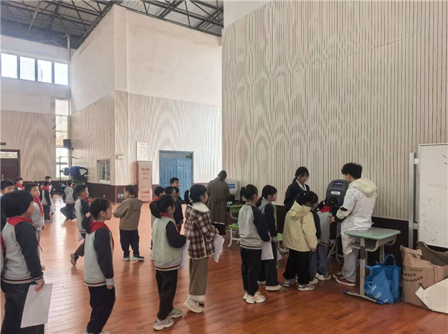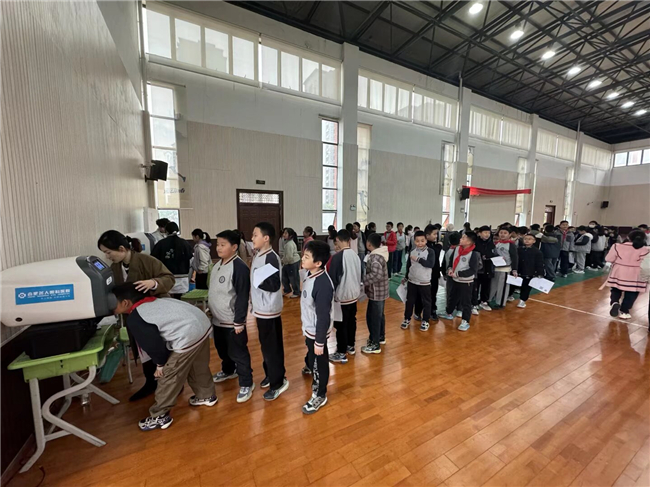 现场实行 “分级错峰 + 三维协作” 机制:班主任提前核查视力档案,体育教师协助分区引导,医护人员按学段优化流程。体育馆内学生们分批,分时段有序进行视力监测,低年级学生由专人用趣味图谱引导,高年级学生通过电子签到快速核验。检测采用全自动验光仪与标准对数视力表组合模式,重点监测裸眼视力、屈光度及远视储备量,数据实时上传至 “一生一档” 电子健康档案,实现筛查全程可追溯。