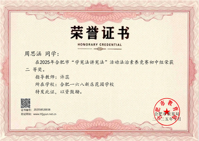 宪法如炬,照亮成长之路;少年如潮,涌动法治情怀。近日,合肥市 2025 年中小学生 “学宪法讲宪法” 活动捷报传来,合肥一六八新店花园学校周思涵同学历经区级遴选、市级比拼的层层考验,最终斩获市级二等奖,以青春之力诠释宪法精神,用扎实学识书写少年担当。