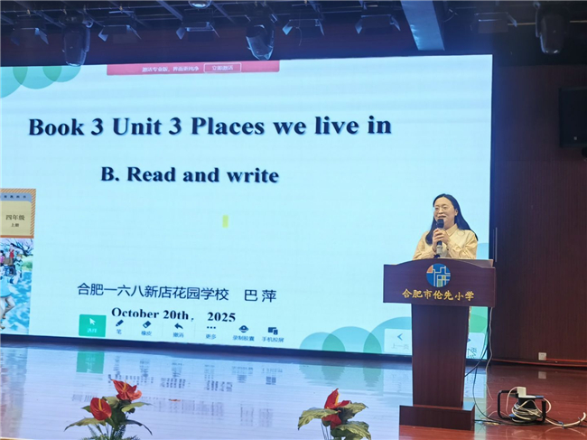 活动上各位老师以人教版PEP四上Unit3为课例依次进行说课展示,其中合肥一六八新店花园小学英语教研组长巴萍老师负责本单元read and write 读写课进行说课,该课亦为合肥一六八新店花园学校小学英语组课题《信息技术与小学英语读写课融合的项目式学习实践研究》(HDJ24121)的成果展示。