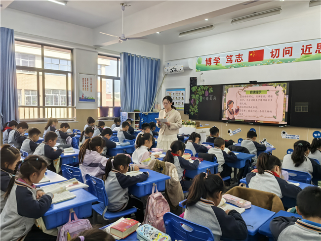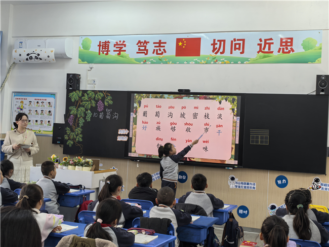 公开课开篇,教师吕舒婷紧扣 “初读课文识生字” 任务,为二年级学生设计了 “阶梯式” 自主学习路径。她先引导学生对照 “自读提示” 学习思考 “葡萄沟是个什么样的地方”。学生们捧着课本轻声朗读,不时用笔标记,课堂氛围专注而有序。同时她还创新设计了 “语境闯关” 游戏,学生们纷纷举手抢答,在具体语境中轻松掌握多音字用法,打破了传统识字的枯燥感。 书写指导环节,吕老师以 “份”“枝” 两个生字为范例,逐笔拆解笔顺、分析结构特点。她一边示范书写,一边让学生临摹,既培养了学生规范书写的习惯,又加深了学生的生字记忆。