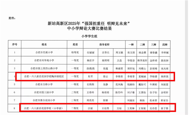思辨点燃智慧火花,交锋锤炼卓越品格。近日,合肥市新站高新区“强国担重任 明辩见未来”主题辩论大赛隆重举行,为全区学子与青年教师提供了一个激荡思想、展示才华的广阔舞台。合肥一六八新店花园学校教育集团高度重视、精心组织,派出来自本部校区与陶冲湖校区的五支精锐之师,在赛场上展现了深厚的素养与蓬勃的朝气,并最终斩获佳绩。