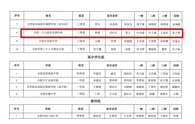 经过多轮激烈的唇枪舌剑与智慧碰撞,合肥一六八新店花园学校教育集团参赛队伍不负众望,载誉而归。其中,陶冲湖校区学生组(一辩李雨菲、二辩夏栩涵、三辩李柏睿、四辩焦梓琪)与本部小学教师组(一辩刘化凯、二辩卢娟、三辩刘羊、四辩李梅)凭借缜密的逻辑、犀利的辩才和出色的团队配合,双双勇夺一等奖。