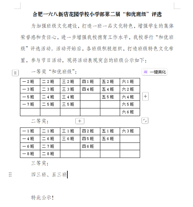 “和优班级”的评选,是合肥一六八新店花园学校践行“和合”校训文化的重要载体。“和”寓意着和睦、和谐,倡导师生之间、生生之间团结友爱,营造融洽的校园氛围;“合”则代表着合作、合力,鼓励班级凝聚集体智慧,携手共同进步。此次获奖的班级,正是在班风建设、学业成绩、活动参与等方面展现出高度和谐与强大合作精神的优秀集体。
