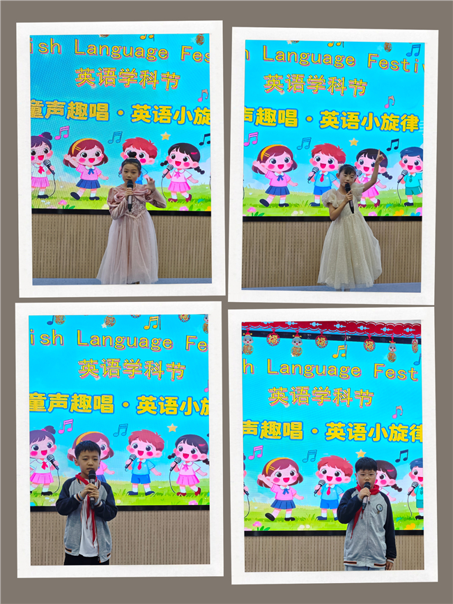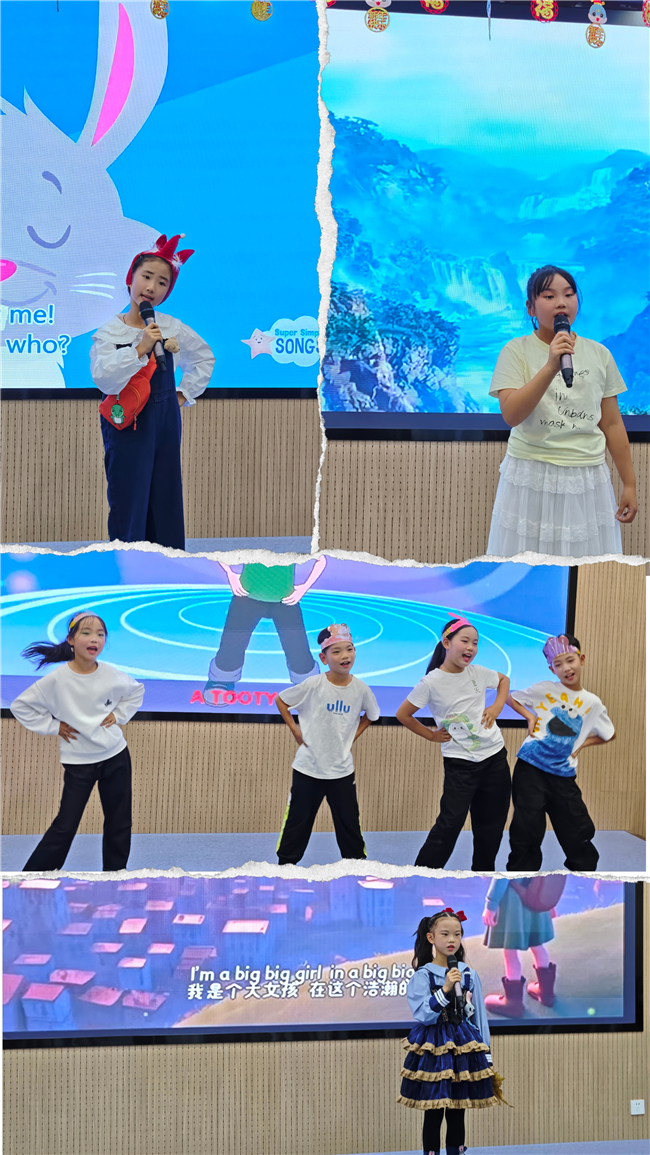 三年级“童声趣唱・英语小旋律”歌唱比赛率先点燃活力氛围。小选手们身着靓丽服装,带着饱满的笑容登上舞台,Who took the cookie的轻快旋律、Big big world的温暖曲调,从孩子们清澈的童声中流淌而出。他们伴着节奏摆动身体,有的孩子还手持道具,用灵动的表演让歌声更具感染力。台下师生跟着节拍轻轻哼唱,掌声与欢呼声此起彼伏。