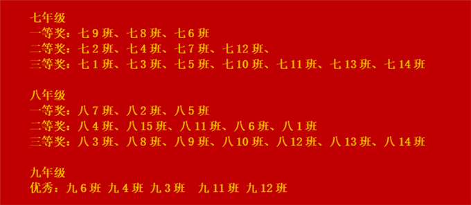 经过严谨评审,各年级优秀班级脱颖而出.政教处杨主任宣读了获奖名单,充分肯定了本次班级文化建设活动中各班的用心布置和特色设计。七年级中,七 9 班、七 8 班、七 6 班斩获一等奖,七 2 班等 5 个班级获评二等奖,七 1 班等 7 个班级荣获三等奖;八年级里,八 7 班、八 2 班、八 5 班摘得一等奖,八 4 班等 5 个班级获评二等奖,八 3 班等 7 个班级获得三等奖;九年级的九 6 班、九 4 班、九 3 班、九 11 班、九 12 班获评优秀班级。这些班级用创意与用心,为全校树立了班级文化建设的标杆。
