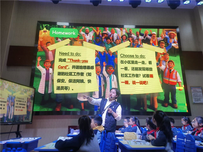 张雨萌老师运用AI技术,将静态词汇动态化,使知识直观可感;通过为社区劳动者赋予姓名与身份,营造了有温度的语言场景,为学生口语输出提供了有力支撑。万梅老师则从学生的真实社区经验入手,将生活与教材紧密结合,让“社区互助”从抽象概念变为可感知的实践,既夯实了语言基础,也培养了学生的社区意识。