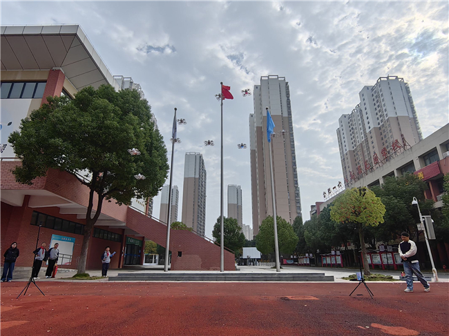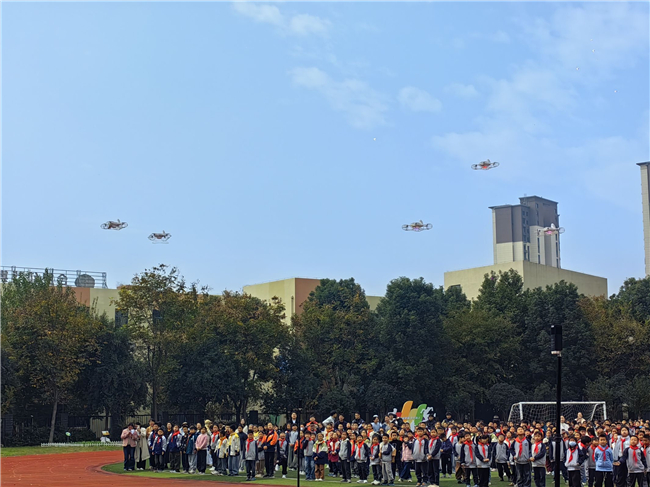 启动仪式在无人机的轰鸣声中拉开帷幕,瞬间点燃了全场的热情。首先上演的是无人机编队飞行,多架无人机在天空中精准悬停、同步变换队形,犹如一群灵动的科技精灵,在蓝天上绘出优美的几何图案,赢得了师生们的阵阵惊叹。紧接着,穿越机拉烟表演将气氛推向高潮,伴随着激昂的音乐,穿越机拖着彩色的烟雾,以极快的速度在空中极速穿越、翻转,划出一道道绚丽的轨迹,展现了速度与科技的完美结合,也象征着我校学子探索未知的激情与活力。