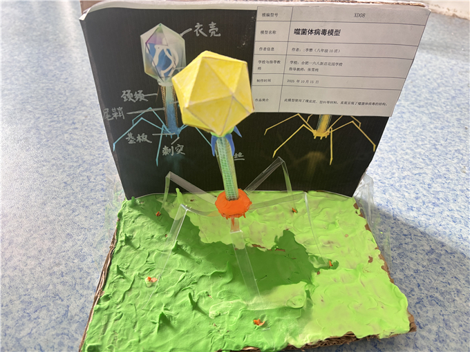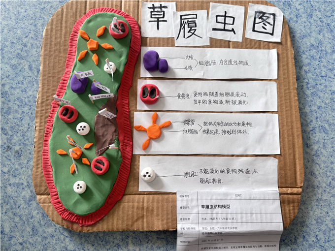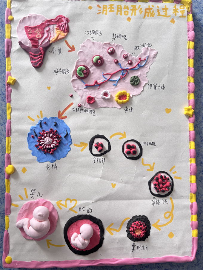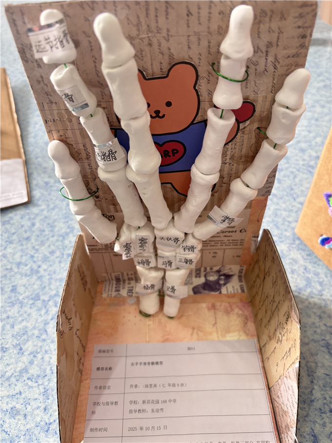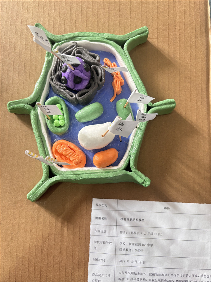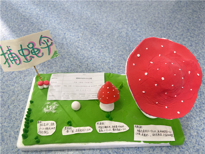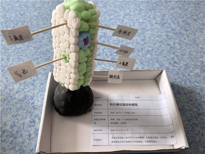 创意是作品的灵魂,而科学则是创意的根基。我校学子在创作中充分发挥想象力,将生活中的常见材料与生物学知识巧妙结合,我校参赛作品覆盖微生物、动植物、人体结构等多个生物学领域,精品频出。八(10)班的甄思齐《草履虫结构模型》和李懋同学的《噬菌体结构模型》精准还原微观生物的核心构造,让肉眼不可见的生命形态直观呈现;七(2)班的王梦琪《捕蝇伞的生长过程》以分层立体设计,生动展现真菌从孢子萌发到成熟的完整历程;《鱼的模型》《动植物细胞模型》《植物细胞结构模型》贴合生物形态与结构规律,材料运用巧妙,特征鲜明;其中汤雯茜的《右手手背骨骼》模型细致复刻人体器官与骨骼构造,细节把控精准;《叶片横切面结构模型》深入植物微观世界,清晰呈现组织分布与功能关联;《人体胚胎形成过程》则以立体递进形式,诠释生命孕育的奇妙旅程。
