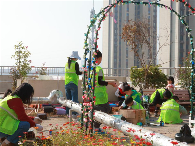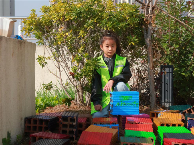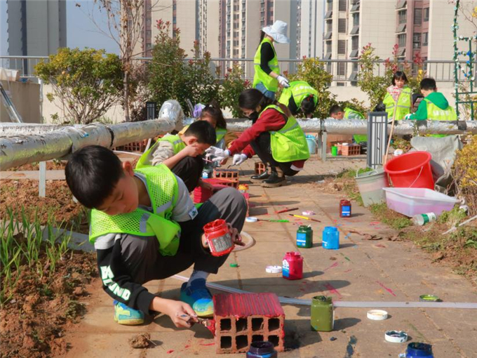 绘制完成后,师生与家长共同将花砖铺设于顶楼种植区,后续将拓展“空中花园”功能,计划增设花卉种植、雨水收集等生态设施,推进楼顶绿化改造,推动“绿色社区”建设。
