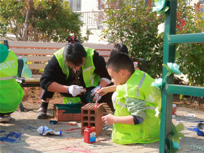 在社区人员指导下,学生与家长以“二十四节气”“和合文化”为灵感,用环保颜料在定制花砖上绘制图案。亲子协作中,孩子们专注调配颜料,家长则协助构图,现场充满欢声笑语。