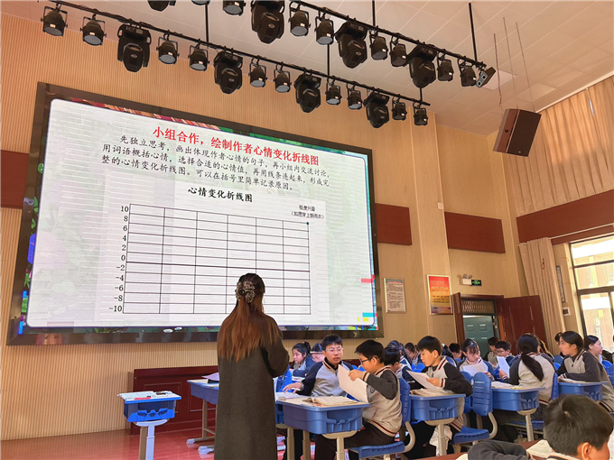 在“动静相融,品‘盼’”环节,活动聚焦文本中的描写技巧,教师带领学生们赏析文中的动作、环境与心理描写语句。从“抖抖袖子”“奔进厨房”等动作中捕捉人物急切心情,从“小杨树沙啦啦喧闹”“雨点儿起劲跳跃”等环境描写中体会“借景抒情”的妙处,并利用AI技术,让书中的人物活灵活现。更通过“心情变化折线图”小组合作活动,直观梳理出作者从“开心”“失落”到“极度兴奋”的情感起伏,深刻理解“一波三折”的叙事手法对凸显“盼”这一核心情感的作用。