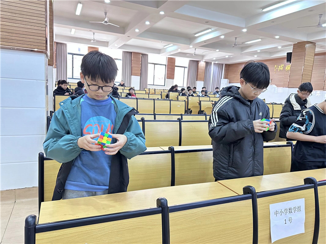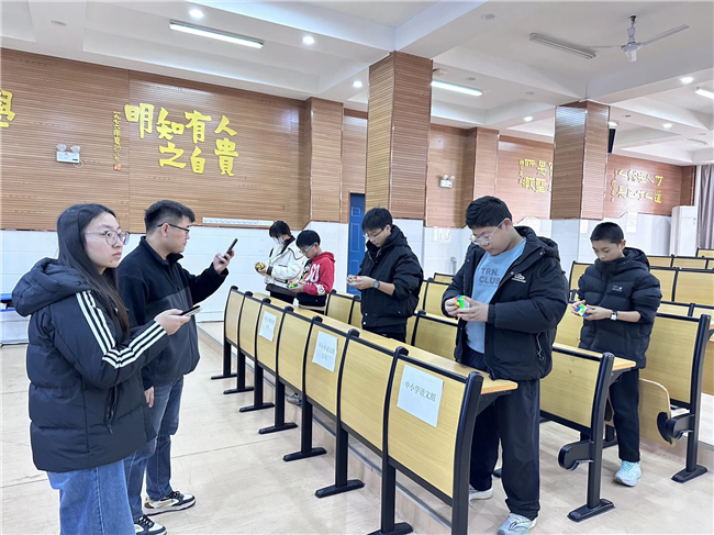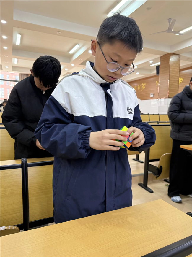 11月27日中午,合肥一六八新店花园学校小报告厅内掌声与魔方转动的"咔嗒"声交织,一场兼具速度与智慧的魔方比赛在此热烈举行。本次赛事为全校魔方爱好者搭建了展示技艺、交流学习的平台,吸引了七年级多名选手同台竞技,在紧张角逐中展现青少年的专注力与探索精神。
