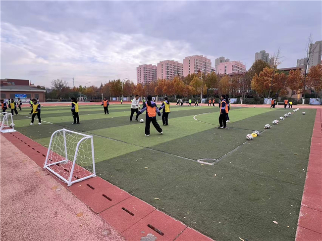 课堂上,周斌以生动有趣的热身迅速调动起学生们的参与热情,将足球基本技能与趣味活动巧妙融合。他通过精准的动作示范、清晰的要领讲解,引导学生从原地练习到移动传球训练,逐步掌握脚内侧传球的动作规范。