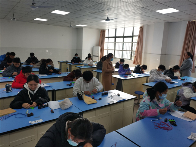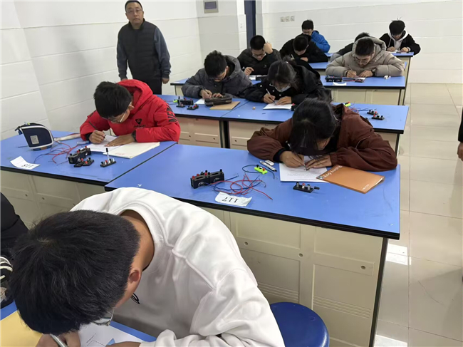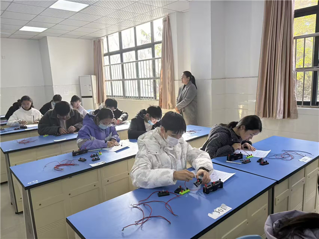 九(9)班的一位同学设计出了精巧可靠的电路方案:“我们利用单刀双掷开关的特点,确保了左右转向灯不可能同时亮起,同时蜂鸣器在任何一侧转向灯亮时都会响起。”在电路连接实践环节,同学们认真细致,不断调试和完善自己的作品。当第一位同学成功完成电路连接,蜂鸣器随着转向灯开关的拨动而发出清脆的响声时,实验室里响起了热烈的掌声。