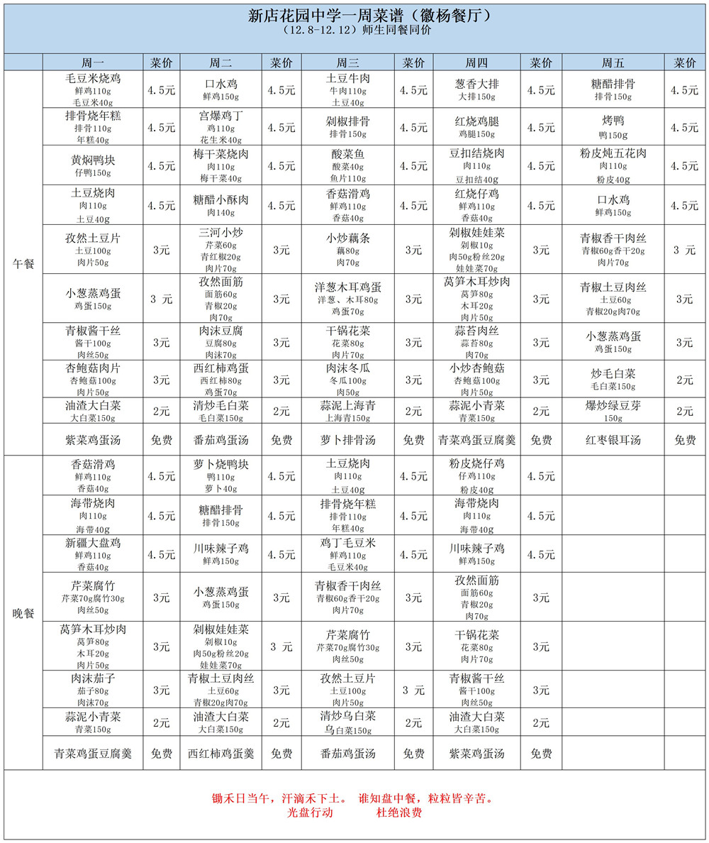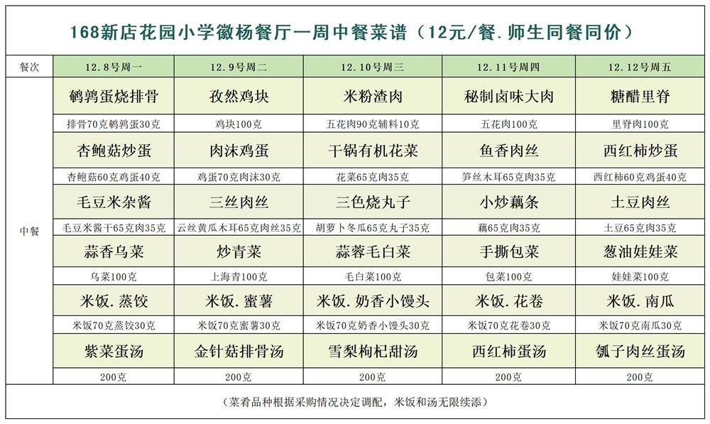 合肥一六八新店花园学校一周菜单(12月8日-12月12日)