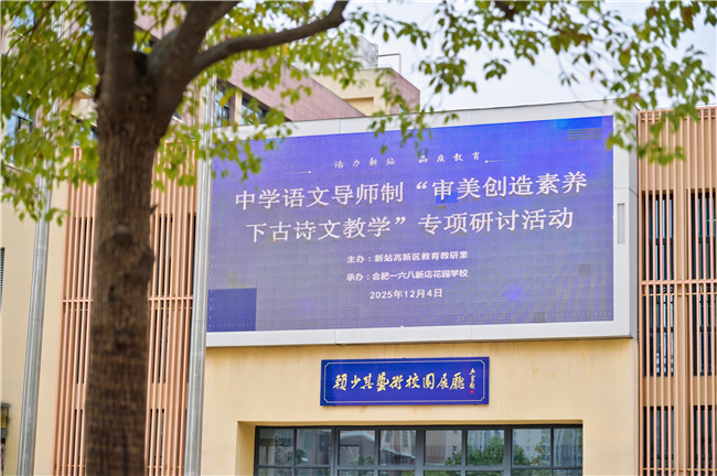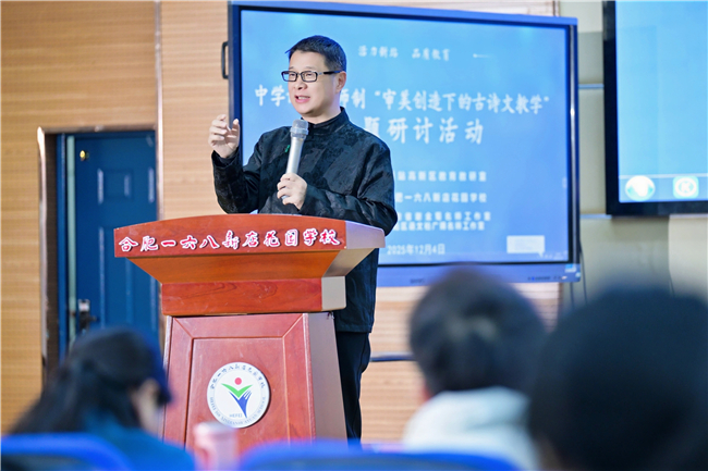 冬日暖阳聚贤才,诗韵雅堂研教学。12月4日,由合肥新站区教育教研室主办的“审美创造素养下古诗文教学”专题研讨活动,在合肥一六八新店花园学校成功举办。本次活动聚焦统编教材七、八年级上册古诗教学,特邀全国知名语文教育专家肖培东老师领衔指导,省教科院谢发茹主任、合肥市教科院吴申道主任莅临活动现场,区内中学语文导师制成员、近三年入职青年教师、各中学教研组长及市区骨干语文教师共百余人参与。活动以课例展示、专家点评的形式,探索古诗文教学的“审美创造”路径。