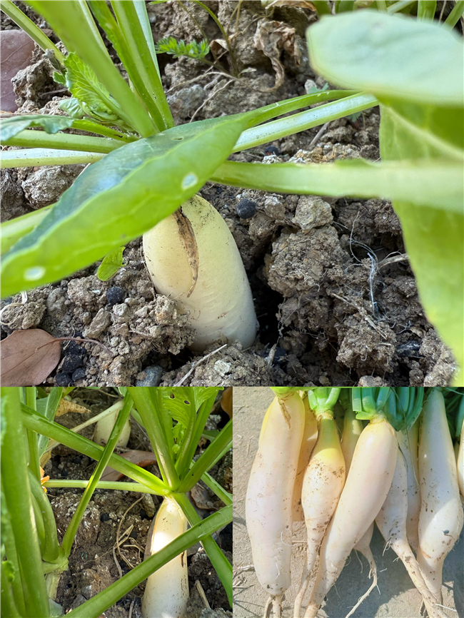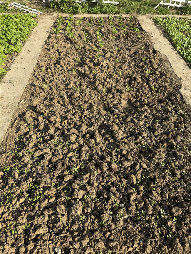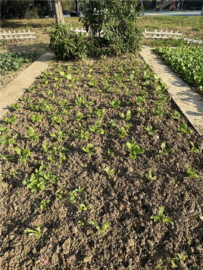 最后,我们给刚收获完的青菜地和萝卜地翻土,准备移栽苦菊秧苗,还给五班的菜地种下了第二批大蒜。从最初的“蔬菜搭档”种植,到如今的“轮作补种”,我们的小菜地还会继续用数学知识种下去。