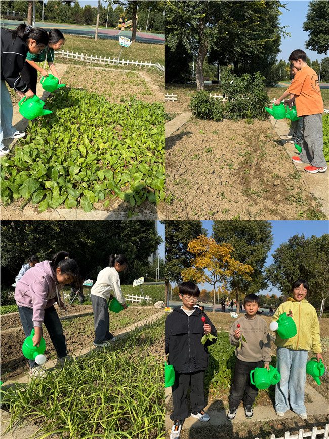 接下来就是播种、浇水、施肥啦。五年级6个班分批进行,天气好的中午大课间,学生们写完课堂作业后,来劳动基地浇水,既能放松放松还可以锻炼身体,最重要的是让我们的小菜苗们喝饱水呀。