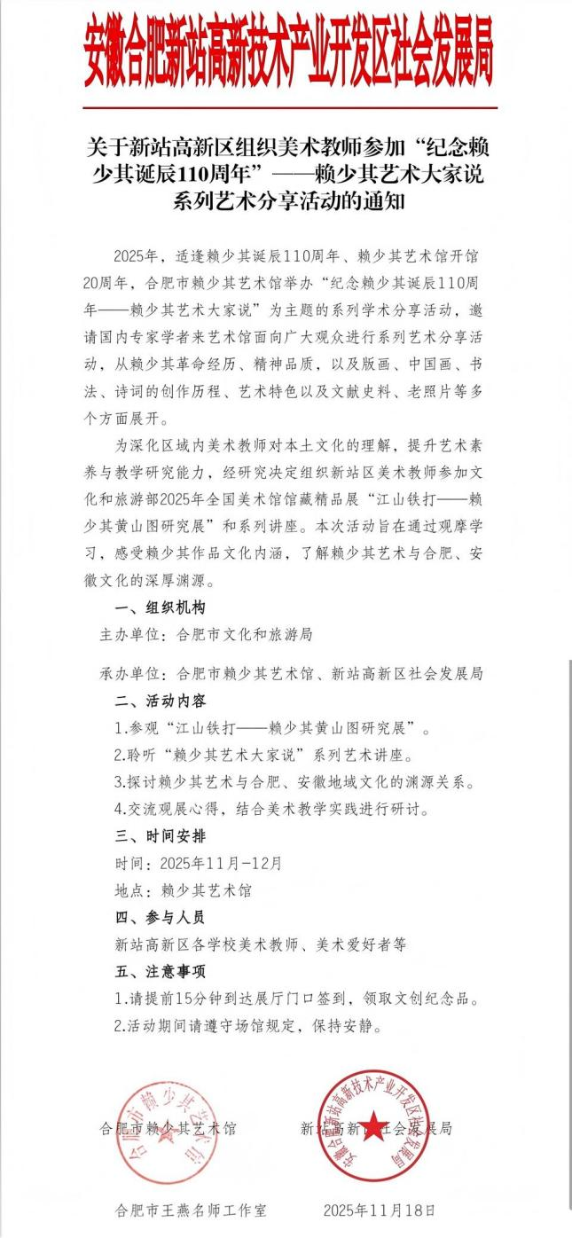 2025 年正值艺术巨匠赖少其诞辰 110 周年暨赖少其艺术馆开馆 20 周年的双庆之际,由合肥市文化和旅游局、安徽省美术馆联合主办,合肥市文化馆(赖少其艺术馆)、合肥新站高新区社会发展局共同承办,合肥市王燕名师工作室协办,合肥一六八新店花园学校与赖少其艺术馆馆校合作 “赖少其艺术大家说” 系列讲座,已在赖少其艺术馆温情拉开帷幕。