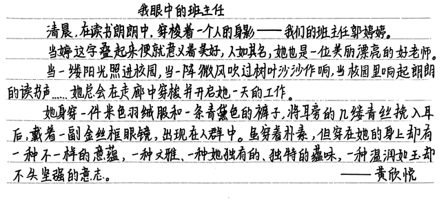 我是高芷怡,在我眼中我的班主任郭老师是一位战斗力极强的老师。每每上课,只要一站上讲台,教室好像瞬间就成了她的领地,就连一颦一笑,仿佛都透露着她的战略意图,举手投足间洋溢着自信的光芒。当她穿上那件白色棉袄,总能令人想到白雪皑皑中傲然挺立的梅花。但,在她的眼底,我总能看见日月星辰,柔美清亮,深邃邈远。当一串串甜美的英文从她口中跳脱,教室里又充满着快乐的味道。