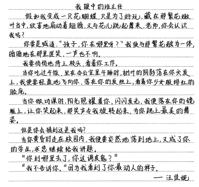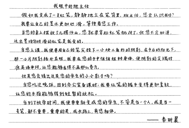 我是贾智翔,假如我能变成一条金鱼,我也要用那短暂的七秒记住我的班主任。记住她的容貌,记住她的声音,记住她对我的每一次关爱。也许很快我就会忘记她,但,我们在一起的美好时光,一定会唤醒我内心深处的记忆。我们都想用自己的方式感谢我们的班主任。