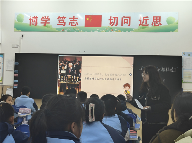 在课堂的情感升华环节,陈晓艳设计了两个角色体验活动:“如果你是站在领奖台上的巴迪,最想感谢谁?” 学生们纷纷表达了对“严格要求”的父亲的特殊感谢,理解了正是那种看似苛刻的爱,推动作者不断超越自我。