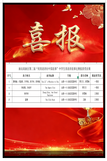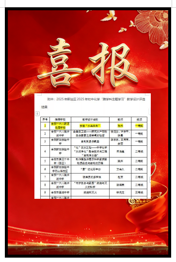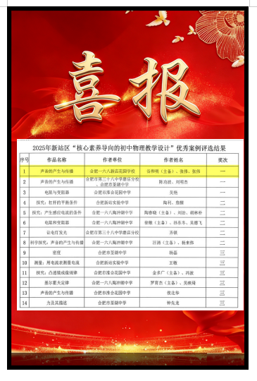 在 “核心素养导向的初中物理教学设计” 评选中,由谷和明主备、张伟参与的《声音的产生与传播》成功摘得一等奖;新站高新区第二届 “用英语讲好中国故事” 比赛里,我校《Yan Zi’s Mission to Chu》《The Empty City》作品拿下 2 项一等奖,另有 2 个作品获三等奖;初中化学 “跨学科主题学习” 教学设计评选中,我校张杰老师的《安徽“水盐共生”》荣获一等奖。