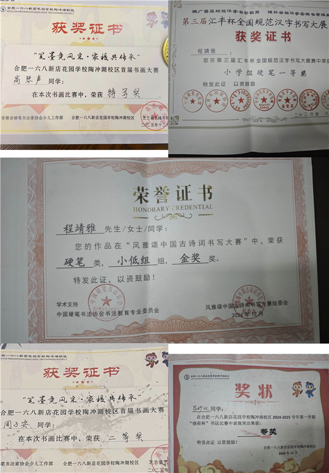 班级的墙面记录着同学们的成长足迹。教室内外的墙面都挂着同学们的书法作品,从最初的稚嫩笔触到如今的流畅运笔,每一幅都是时光的见证。而在教室外的长廊,则成了硬笔书法的展示天地,励志的名句和经典古诗让这里形成了一条可以边走边赏的文化长廊。在这样的氛围中,班级同学们的字也写得越来越好,一张张书法比赛的获奖证书是他们努力的证明。这些证书虽不张扬,却默默诉说着努力与坚持的故事,每次有参观的老师或家长驻足欣赏,同学们都会不由自主地挺直腰杆,脸上露出自豪的笑容。