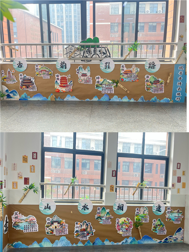 还未走进一 (10 )班教室,走廊里的文化墙便让人眼前一亮。以 “古韵引路,山水相逢” 为主题的墙面设计独具匠心,收录了安徽省 16 个市的代表性古诗,文字与图画相映成趣。让孩子们在古诗中感受家乡之美,升腾起作为安徽人的骄傲。