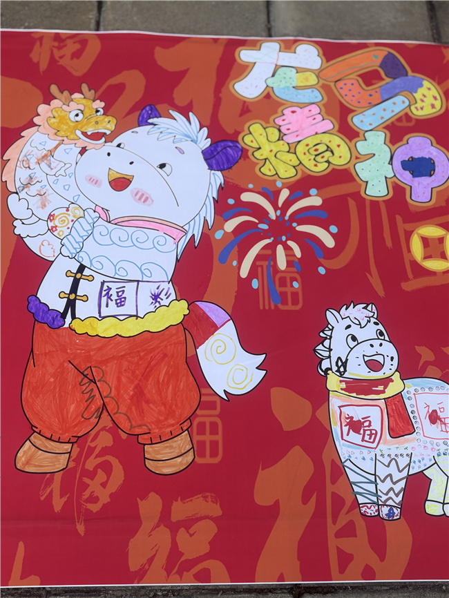 孩子们手持彩笔,化身小小艺术家,以饱满的热情投入创作。他们围在画卷旁,或蹲或跪,神情专注,用稚嫩的笔触勾勒心中的美好。画面上,有红彤彤的灯笼、金灿灿的烟花,有憨态可掬的小马、灵气活泼的孩童,一笔一画间,流淌着童真童趣;色彩斑斓中,洋溢着节日的喜悦。
