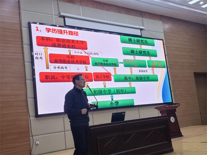 随后,他结合图文资料,系统解读了职业教育与普通教育的区别。职业教育以培养高素质技术技能人才为目标,注重职业道德、专业知识与实践能力的融合,分为职业学校教育和职业培训两类;而普通教育则更侧重于科学研究与理论体系的构建。现场通过对比职高、技校等不同学校的隶属部门、学历序列及培养模式,生动展示了教育体系的多样性与完整性。