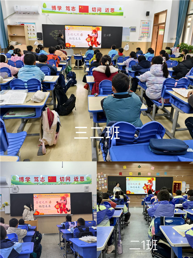 各班级在教室内开展了统一主题、形式活泼的班会活动。班会以生动有趣的“骏马”形象贯穿始终,寓教于乐。老师们通过引导孩子们认识生肖文化、学习马的精神品格,帮助同学们回望过去一年的成长足迹,并学习如何珍惜时间、管理自我。班会高潮部分,同学们畅谈新年愿望,并在老师的带领下庄严宣誓,立志在新的一年里如骏马般奋发向上,争做有目标、有毅力的好少年。班会现场气氛热烈,充满了对新年的期盼与向往。