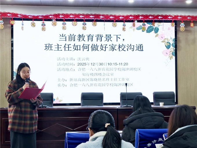 在当前教育背景下,家校沟通已成为促进学生全面发展、构建和谐教育生态的关键环节。如何让沟通更有效、更温暖、更具建设性,是每一位班主任需要不断探索的课题。2025年12月30日上午一场以《当前教育背景下,班主任如何做好家校沟通》讲座在合肥一六八新店花园学校陶冲湖校区举行,本次活动由新站高新区陈晓艳名班主任工作室主办,合肥一六八新店花园学校陶冲湖校区承办。此次活动特邀请新站区心理辅导中心负责人,心理健康教育高级教师,国家二级心理咨询师沈云侠为主讲,沈云侠通过理念引导与互动体验相结合的方式,为班主任们打开了家校共育的新思路。