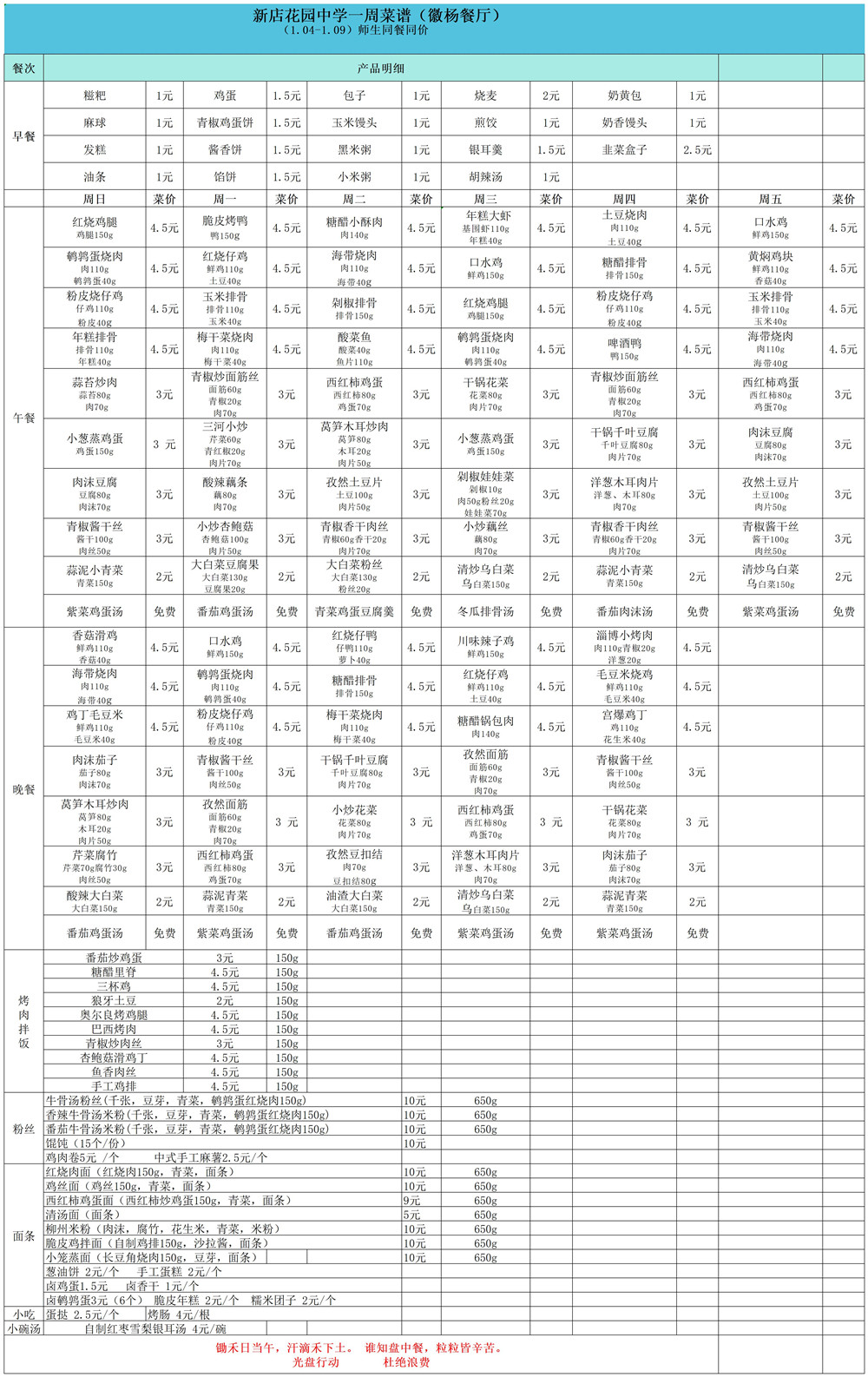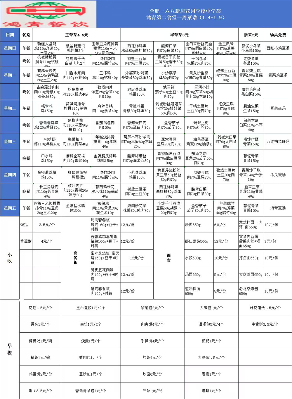 合肥一六八新店花园学校一周菜单(1月4日-1月9日)