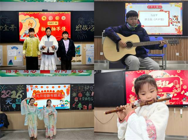 2025年12月31日下午,合肥一六八新店花园学校陶冲湖校区处处洋溢着喜庆欢快的节日氛围。各班级以“ 萌马踏新,童乐元旦”为主题组织开展了形式多样、内涵丰富的元旦联欢活动。孩子们用纯真的笑脸、精彩的才艺和沸腾的热情,将校园变成了欢乐的海洋,在集体的温暖与节日的喜悦中,共同叩响新年的大门,踏上崭新的成长征程。