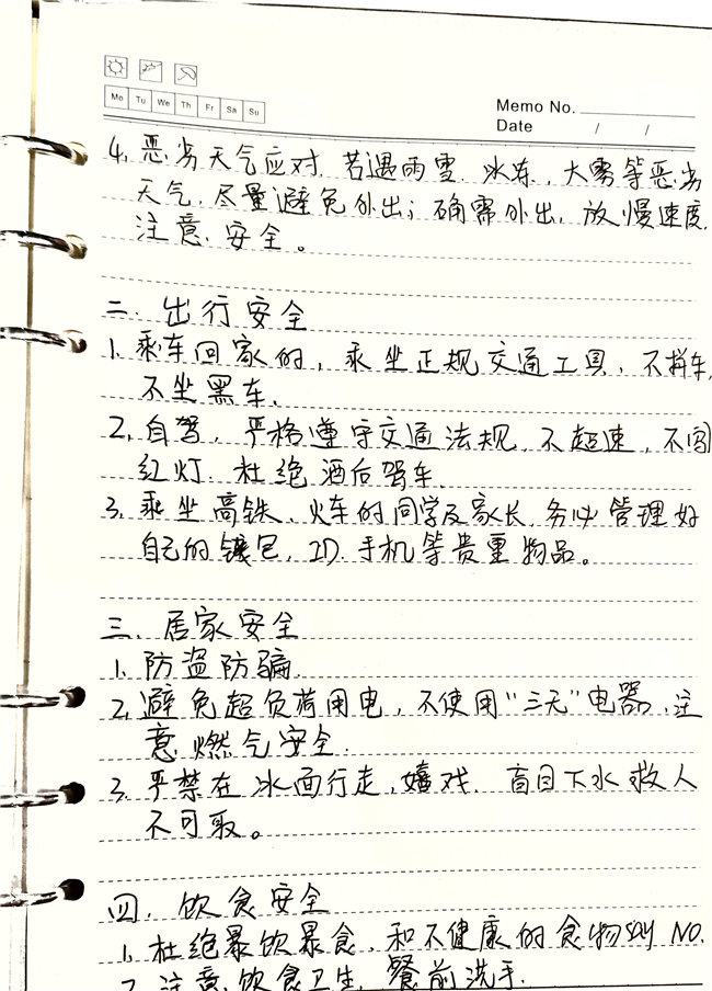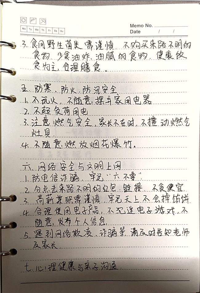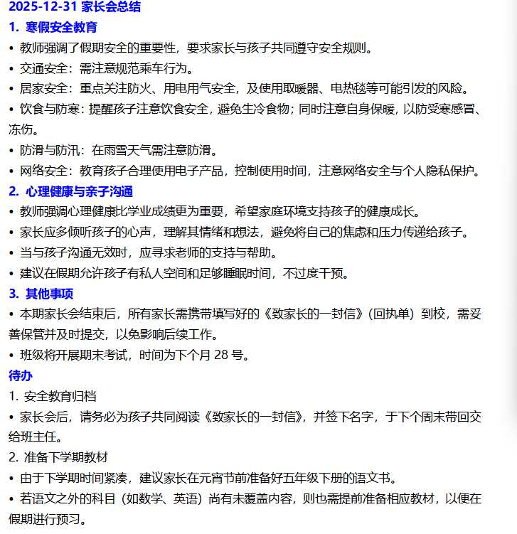 本次家长会系统梳理了假期中可能面临的各类安全风险,并就交通安全、外出游玩安全、居家安全、饮食安全、防寒防火防汛、网络安全与文明上网等方面提出具体细致的指导建议。特别针对冬季出行、居家用电用气、饮食卫生等高频场景,强调了家庭监护与行为规范的重要性,引导家长与学生共同筑牢安全防线。