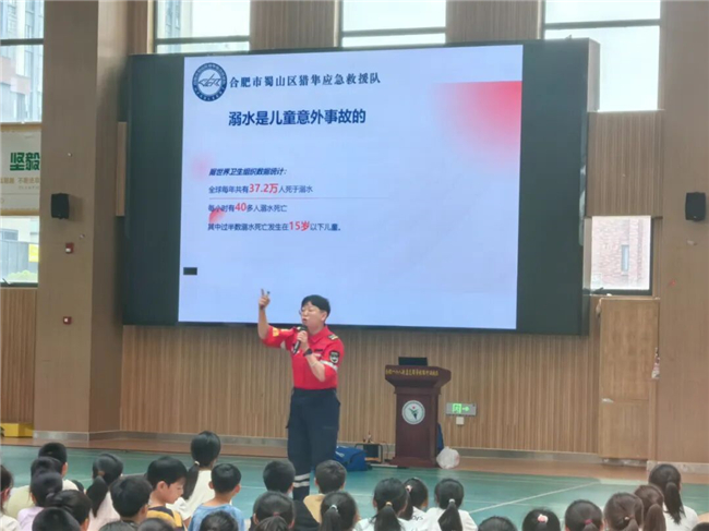 5月27日,合肥市蜀山区猎隼应急救援队走进合肥一六八新店花园学校陶冲湖校区,开展防溺水安全教育宣讲活动。