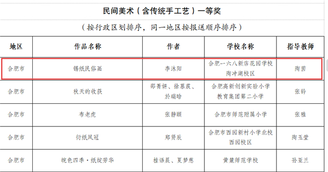 十月的秋风带来了喜讯,在安徽省教育厅以“坚定文化自信,弘扬徽风皖韵”为主题的全省中小学生中华优秀传统文化传承成果专项展演活动中,合肥一六八新店花园学校陶冲湖校区教师陶茵指导的作品《锡纸民俗画》脱颖而出,荣获民间美术(含传统手工艺)类一等奖。
